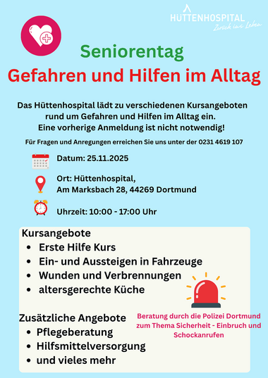 Das Hüttenhospital Dortmund öffnet am 25. November 2025 seine Türen für den Seniorentag unter dem Motto „Gefahren und Hilfen im Alltag“. Von 10:00 bis 17:00 Uhr erwartet die Besucherinnen und Besucher ein vielfältiges Programm mit Kursen, Beratungen und spannenden Mitmachaktionen – ganz ohne Anmeldung.